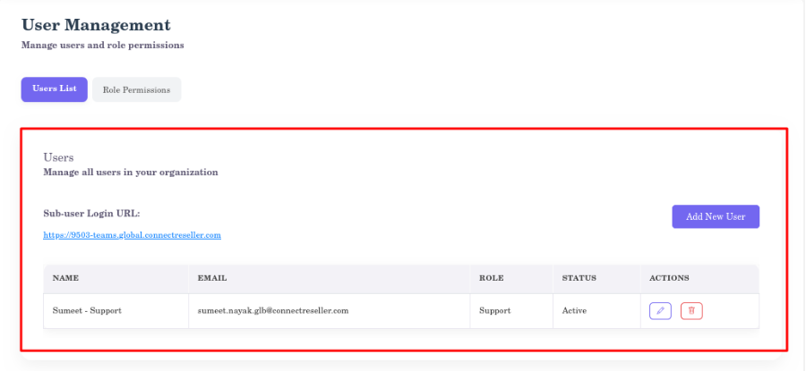 The User Management allows the reseller to create Sub-Users and assign role-based permissions to their team members. Each role can have specific features enabled or disabled to control what the user can access or perform in the dashboard. To find the ...