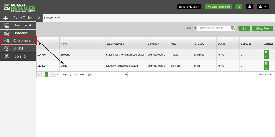 1. Login to your Reseller Panel. 2. Click on "Customer" Option 3.Click on the customer name you want to login. 4. Click on “Login to Panel” 5.Click on the domain you want to add the contact for. 6. Click on "setting" Icon. 7. Select “Contact ...